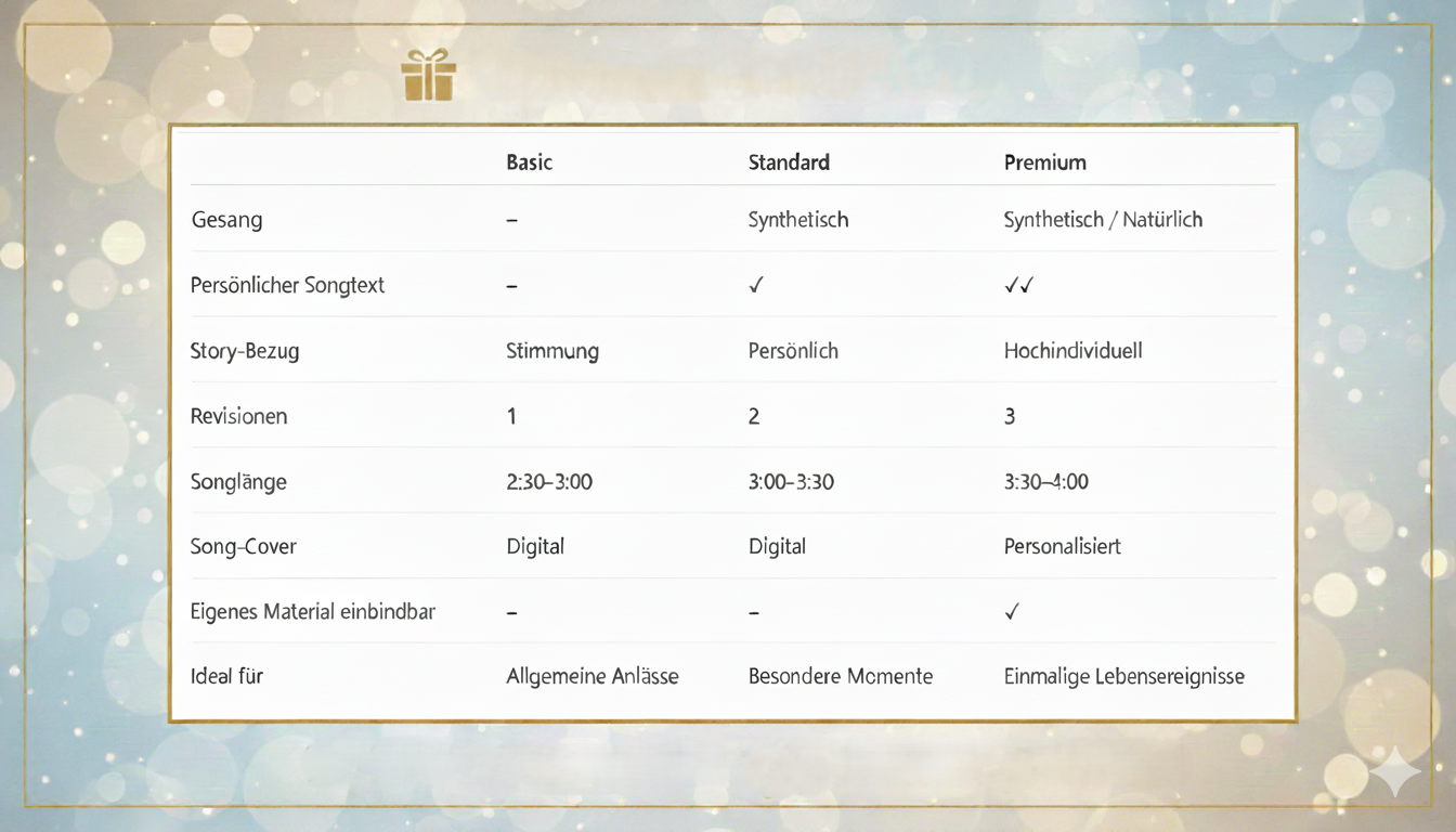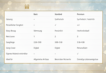 Optional: personalisiertes Song-Cover (Anlass / Stimmung / Beschenkte:r), Songtext als PDF, 24h Express-Lieferung